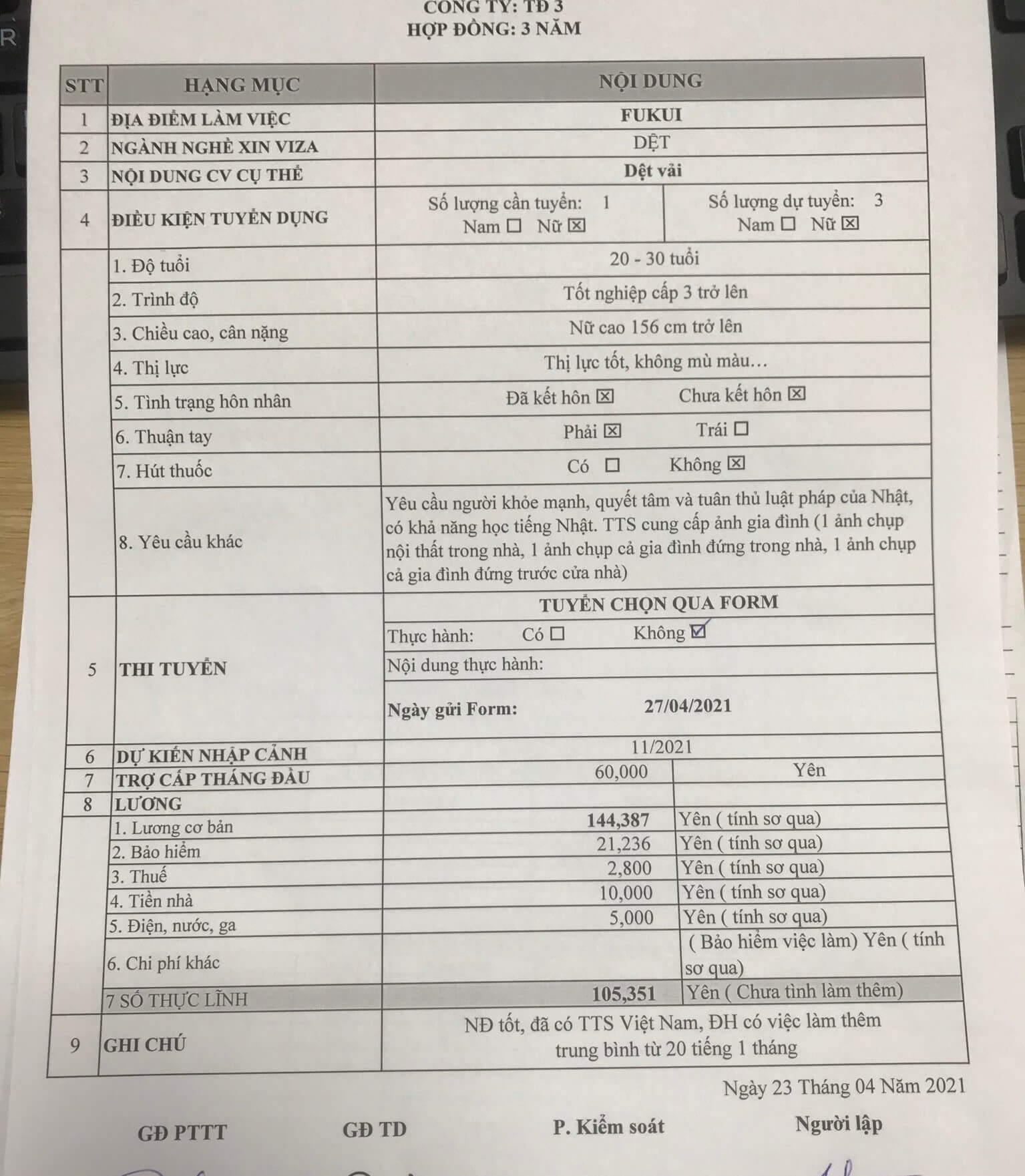 Địa điểm làm việc: FUKUI