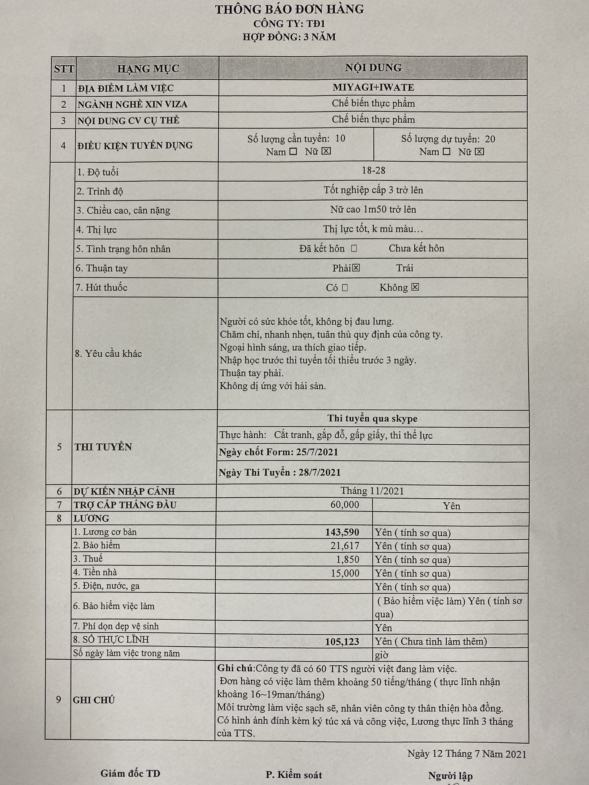 Yêu cầu khác: khỏe mạnh, chăm chỉ, khéo léo, có tinh thần sống tập thể, tuân thủ nội quy công ty và luật pháp Nhật Bản.